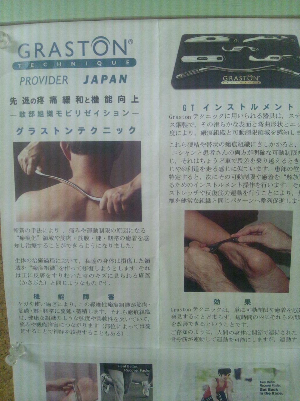 17日はジムの夏季休業を利用して、長年のミット持ちでダメージを受けている体のメンテナンスの為に、尼崎の師匠のところに行って来た。頚椎、仙骨、腸骨、胸椎の歪みを矯正してもらった後、凝り固まり癒着している体中の筋繊維をグラストンで取って貰った。体はかなり軽くなり歩くのも速くなったが、 長年のダメージが一回でなくなる訳はなく、もっとミットの数を減らさないと…、と思う今日この頃、選手のみんな、ロードワークはしてるかい!?